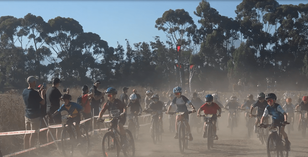 The morning heat fills our room with a preview of the sweltering heat it will become like a din during breakfast increasing to a blare on the drive to the children’s first mountain biking race. In the cool shade between the farm office building and lifestyle centre I offload two junior bikes. The seats and metal frame hot on the back of our vehicle. Beads of sweat pool under my sunglasses, on top of my nose and upper lip while I lift the bikes from the rack. The top of my son’s red helmet is the first to exit the back passenger side and he is the first to start pedalling eager circles on the open paving between parked cars. Water bottles slippery with condensation slide easily into their cages below. On the brisk walk to the registration table, I follow them cycling between the small-wheeled helter-skelter of colourful helmets, bunny hopping onto pavements and down steps. Their school coach meets us at the registration table, dust clouds rising around it with the sun and the first schools league mountain bike boards are fixed to each of their front bars with cable ties.